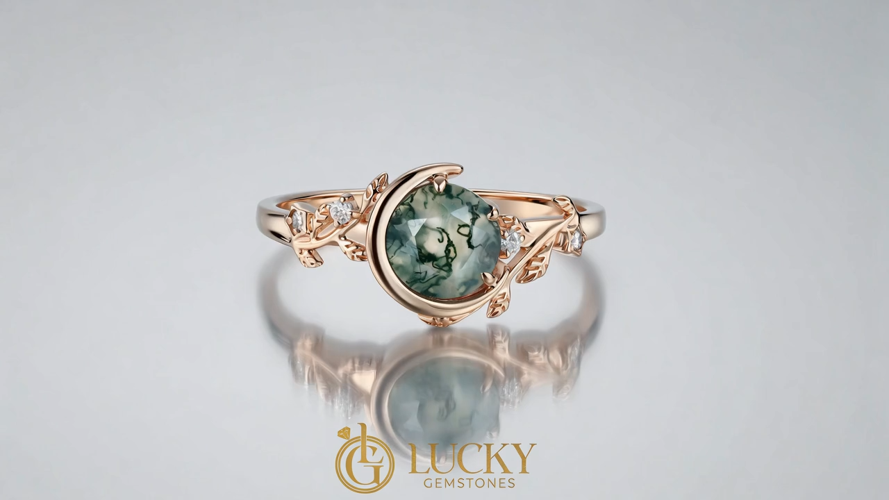 Lucky Round Natural Moss Agate Engagement Ring in Rose Gold | Crescent Leaf Vine Botanical Design with Moissanite Accents